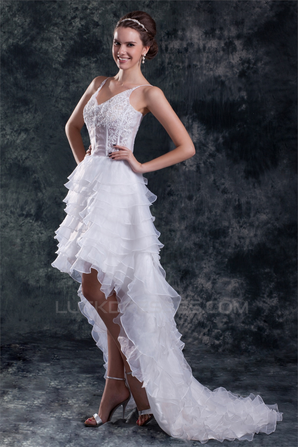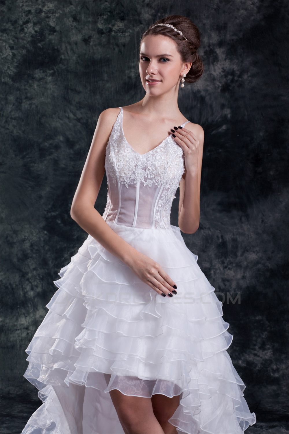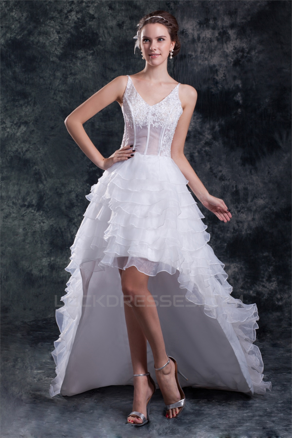-50% Unique Design V-Neck Satin Organza Lace A-Line High Low Wedding Dresses 2031548