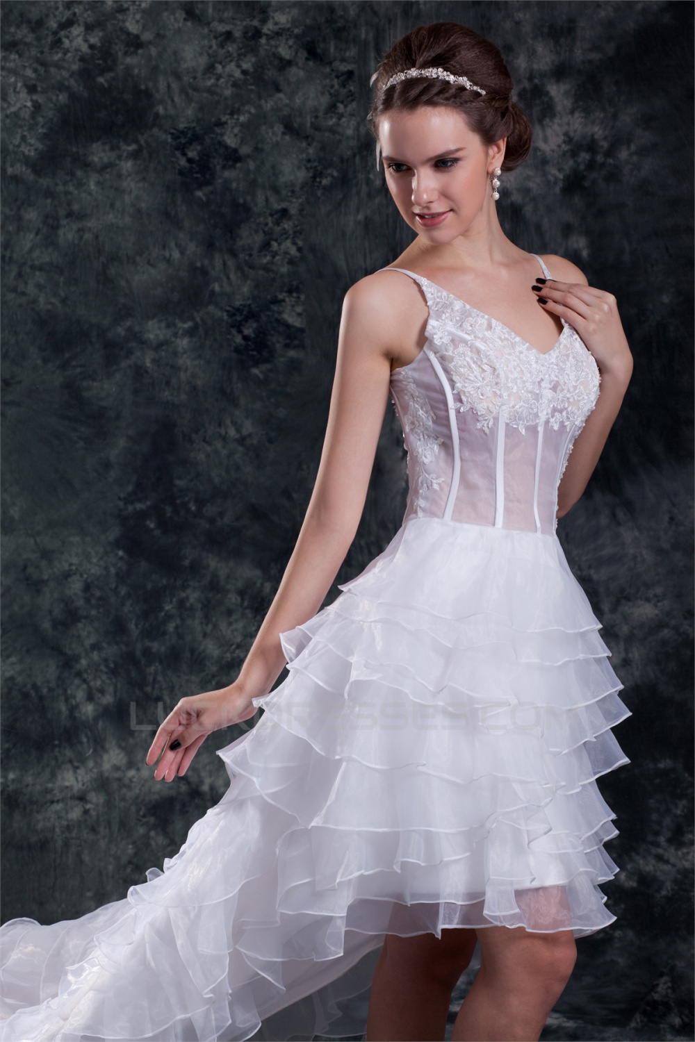 Unique Design V-Neck Satin Organza Lace A-Line High Low Wedding Dresses 2031548