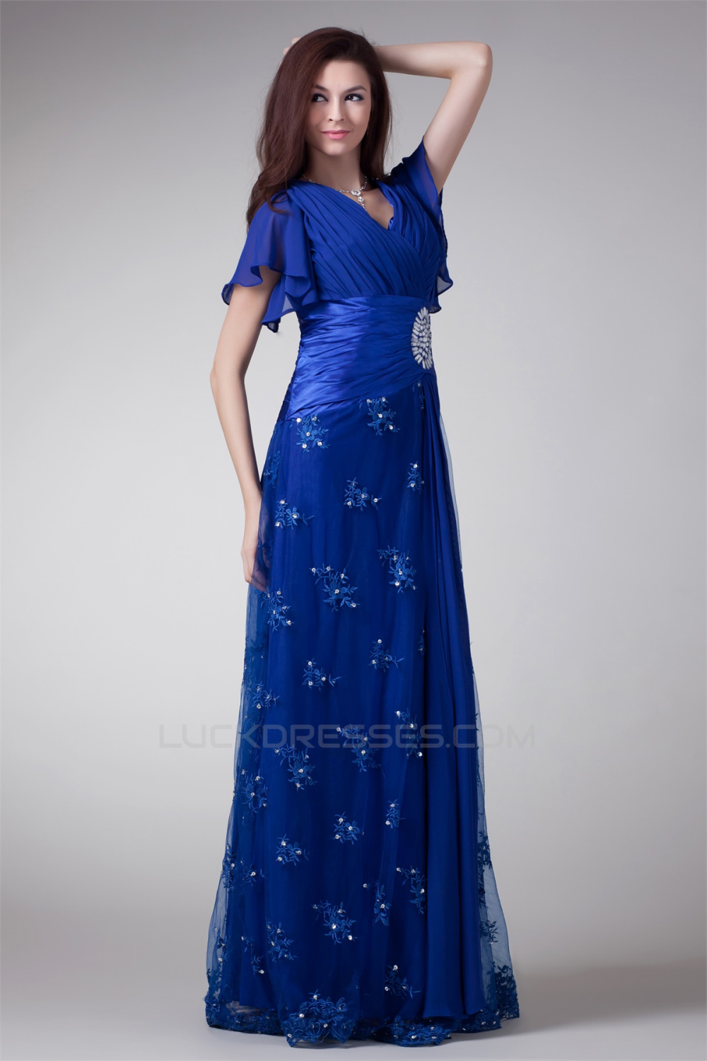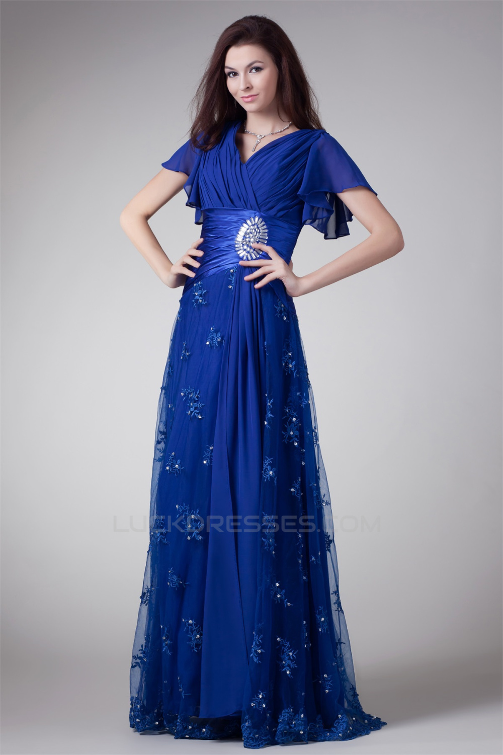 -60% V-Neck Short Beading Chiffon Lace Elastic Woven Satin Prom/Formal Evening Dresses 02020964