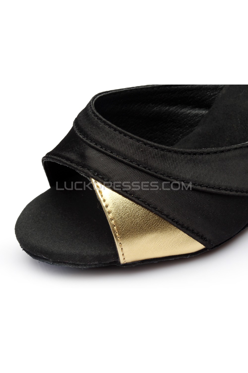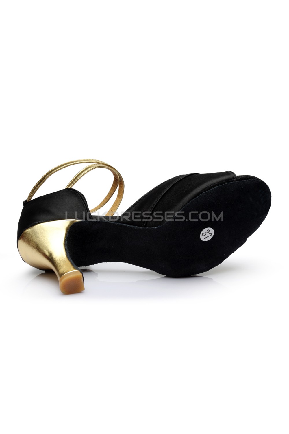 Women's Black Gold Satin Heels Sandals Latin Salsa With Ankle Strap Dance Shoes D602033