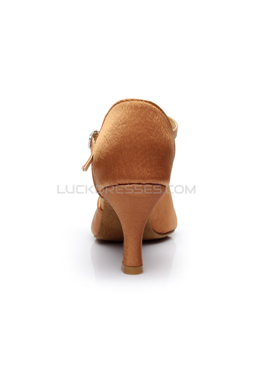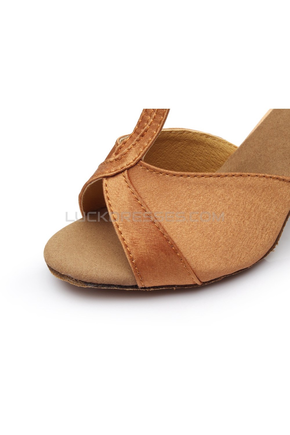 Women's Brown Satin Heels Sandals Latin Salsa Ballroom T-Strap Dance Shoes D602031
