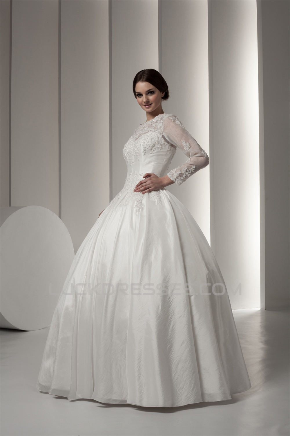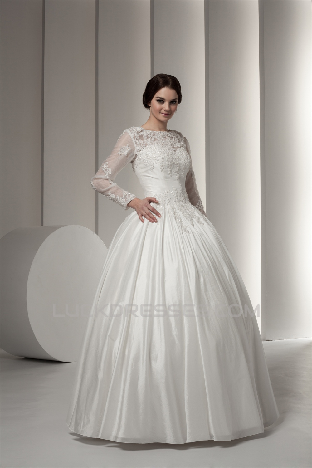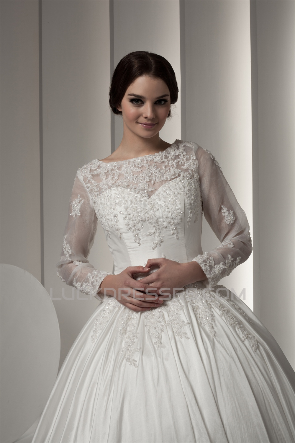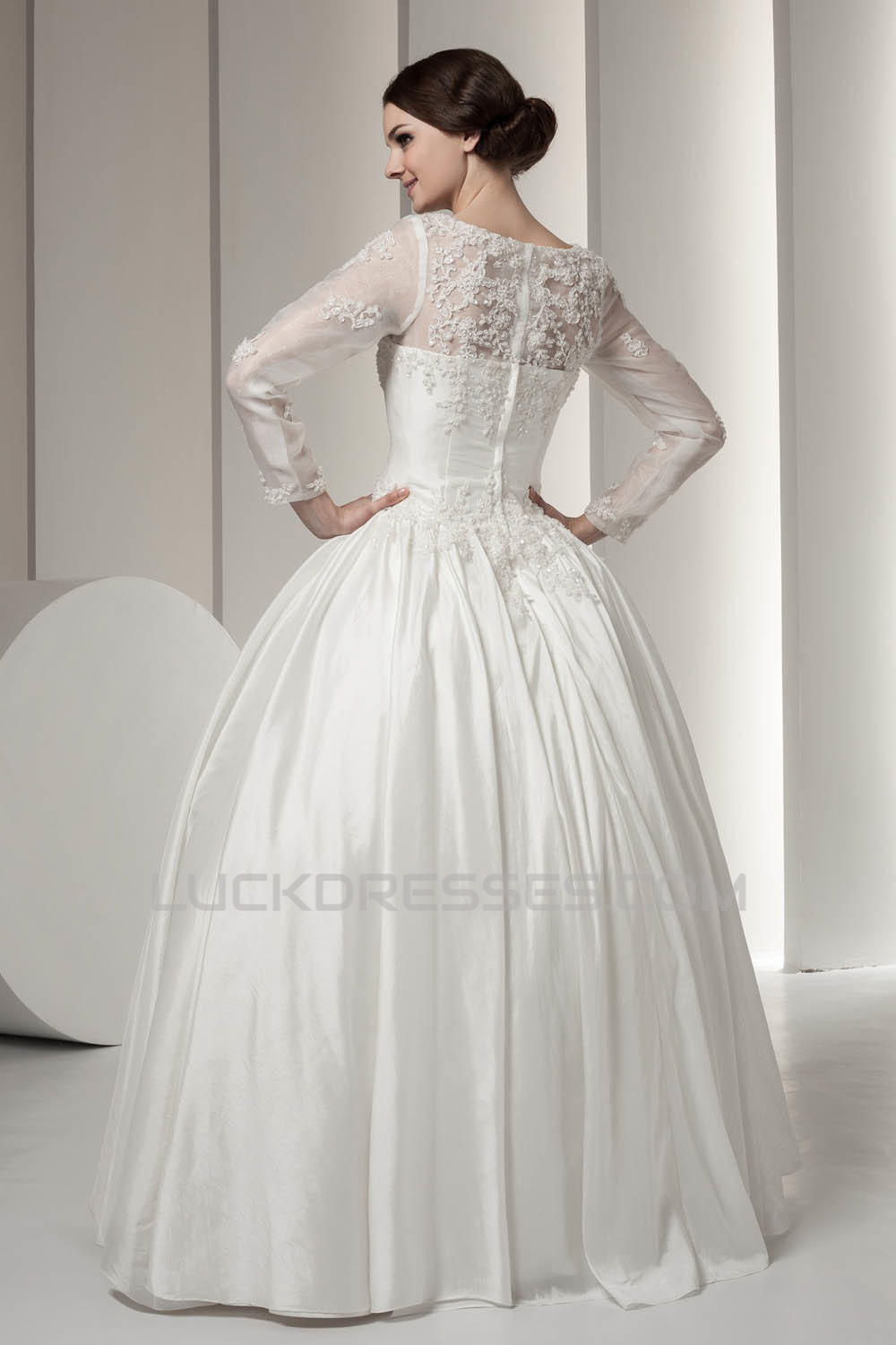 Wonderful Portrait Long Sleeve Satin Fine Netting Lace Floor-Length Wedding Dresses 2031066