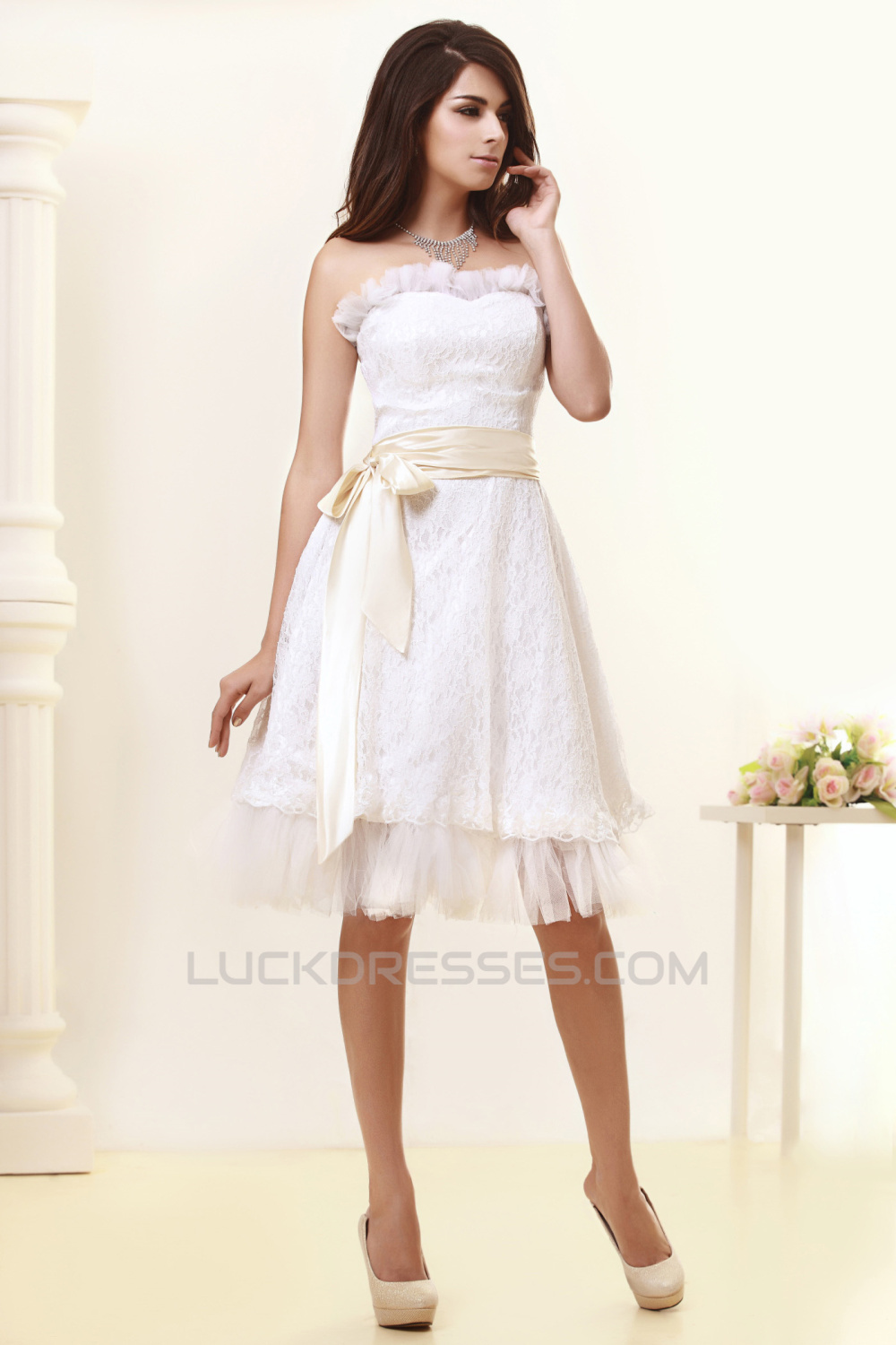 -50% Wonderful Strapless Satin Lace Sleeveless A-Line Knee-Length Short Wedding Dresses 2031550