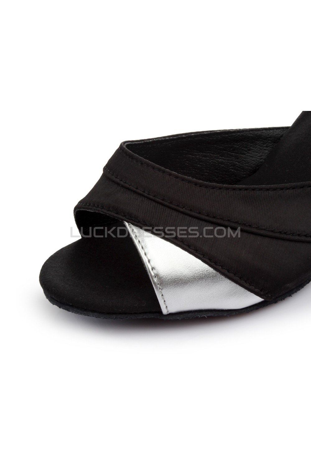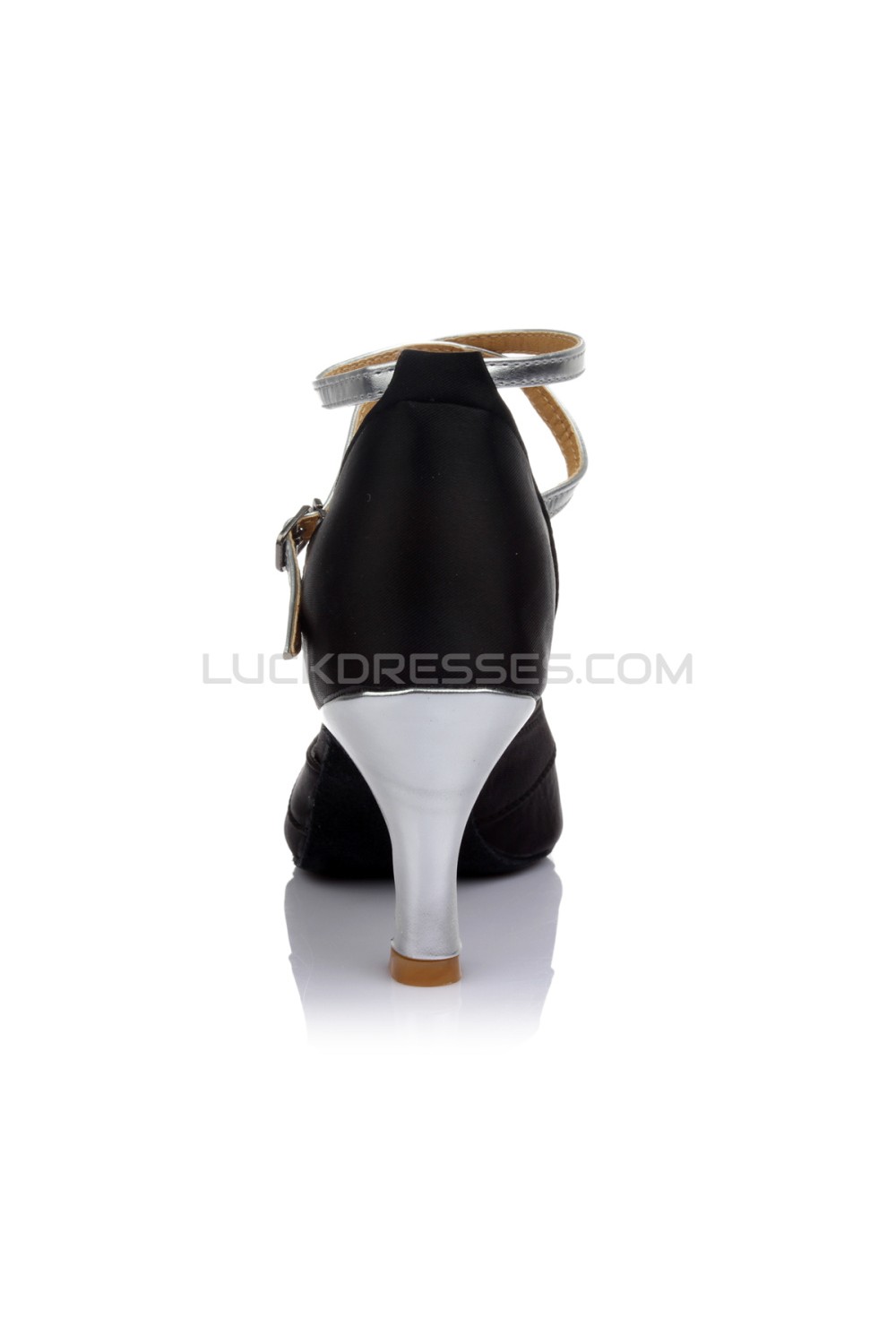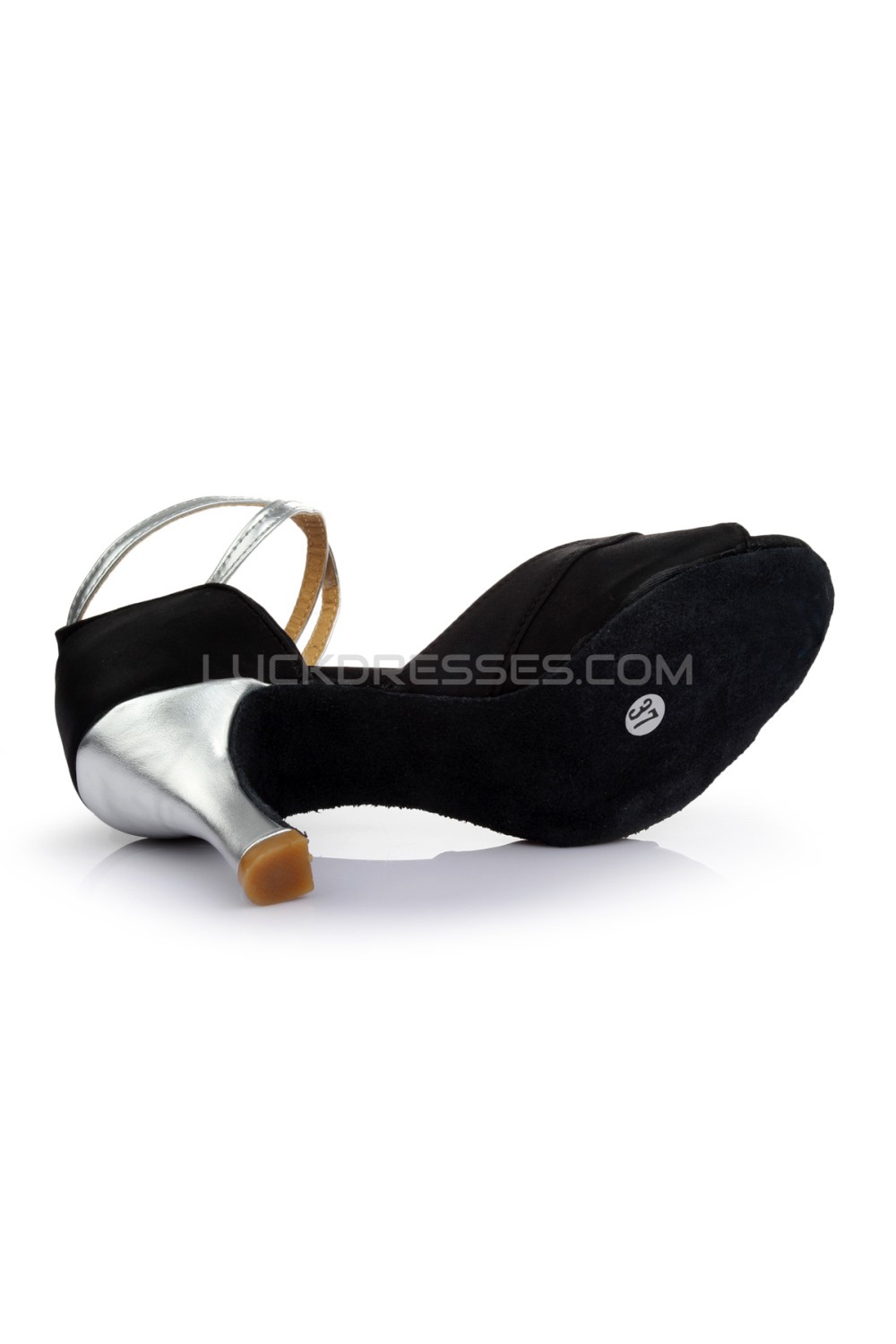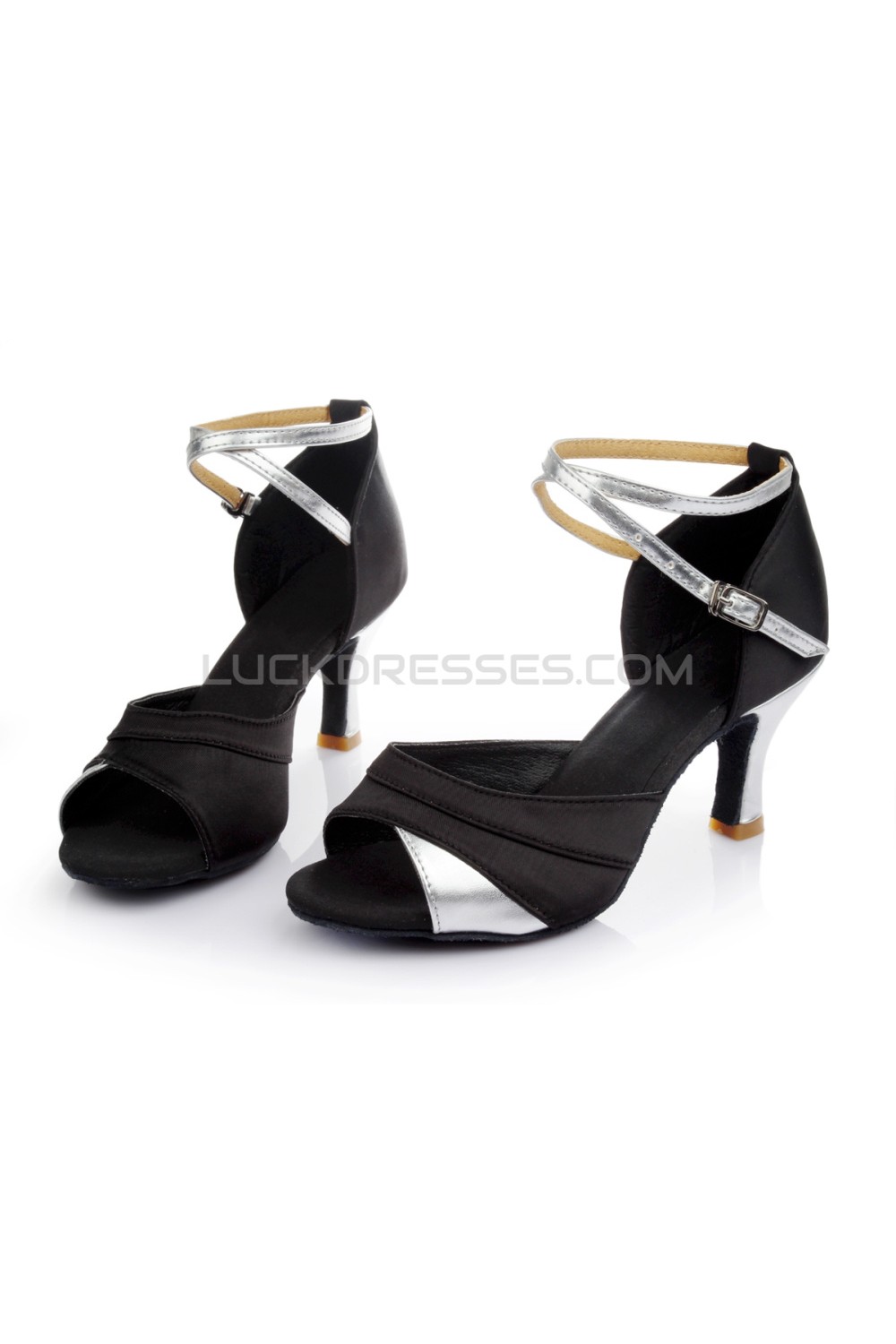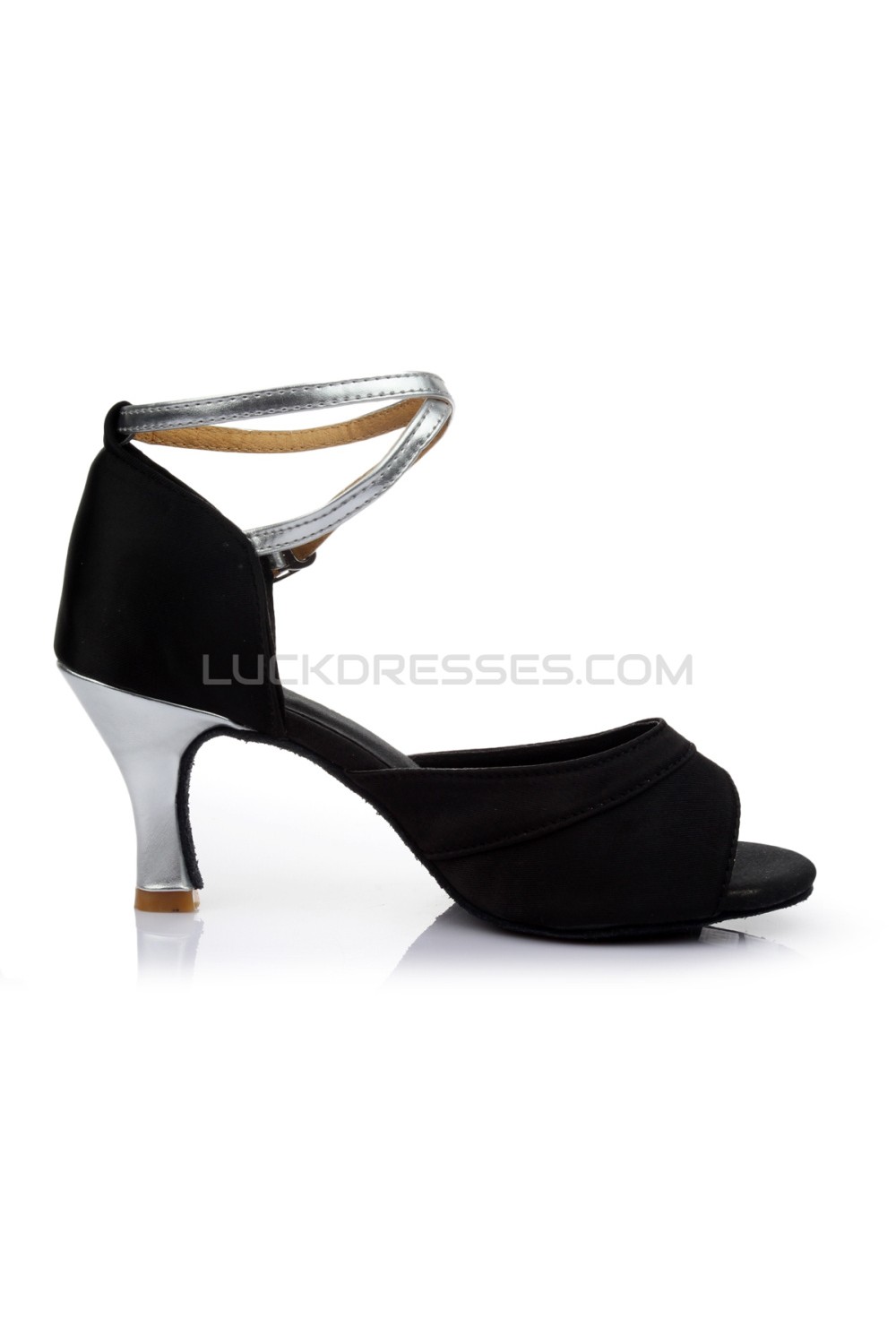 Women's Black Silver Satin Heels Sandals Latin Salsa With Ankle Strap Dance Shoes D602035