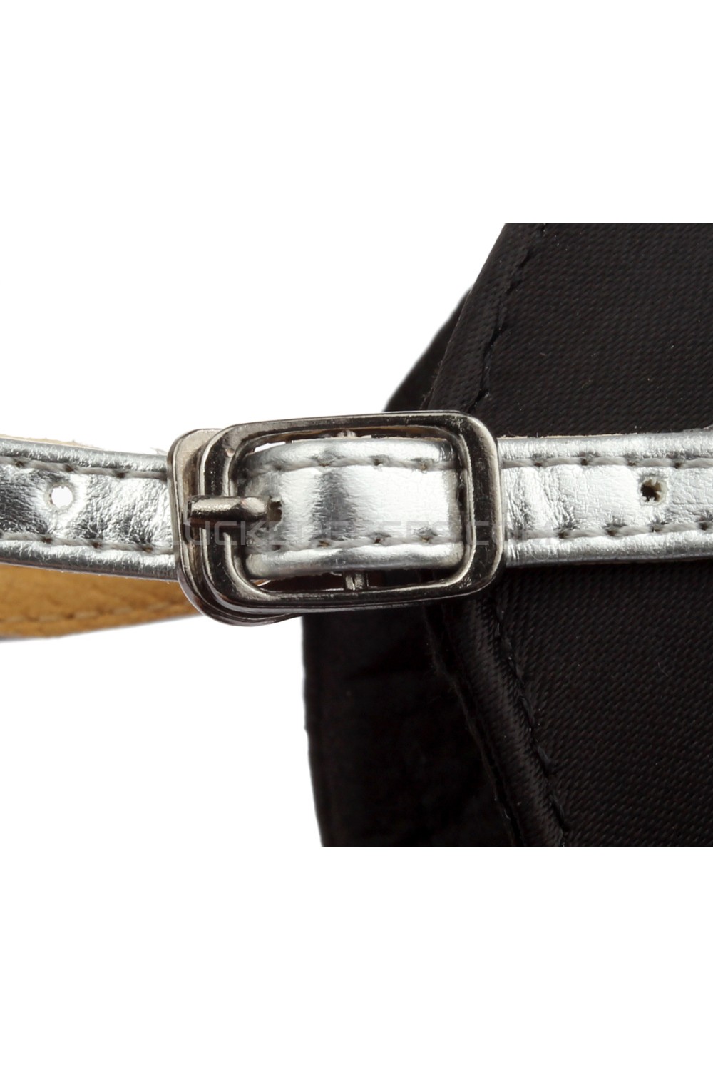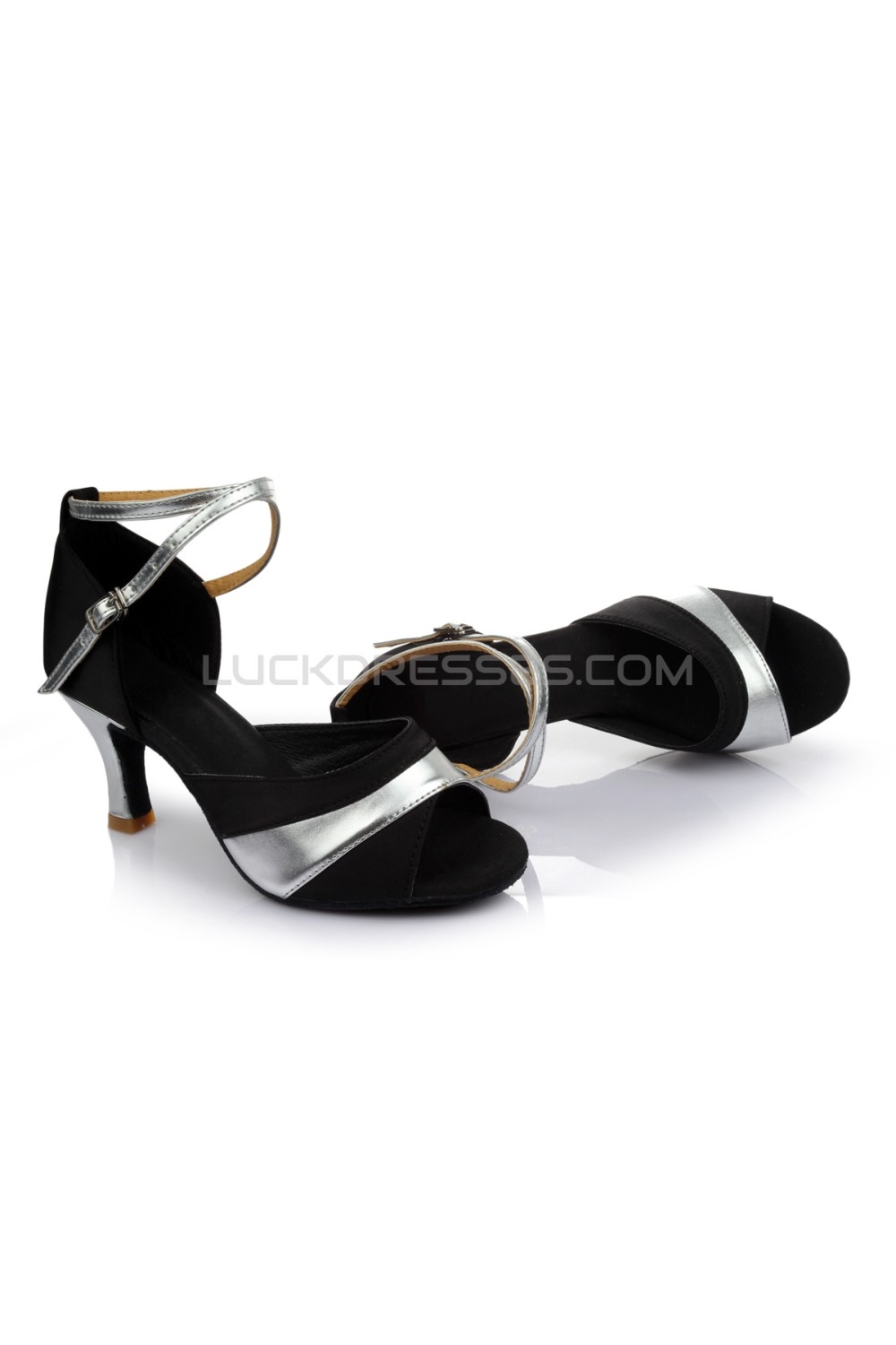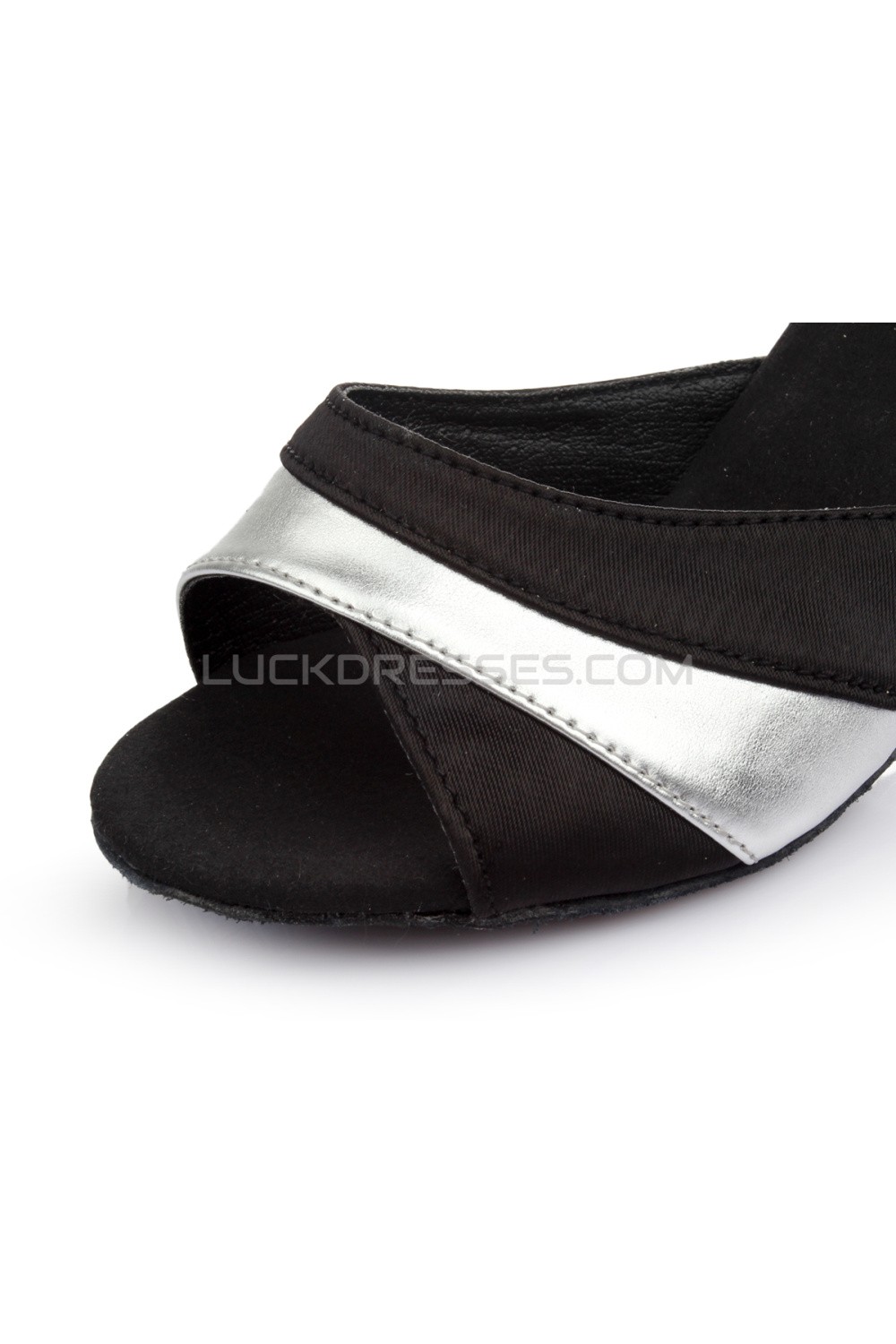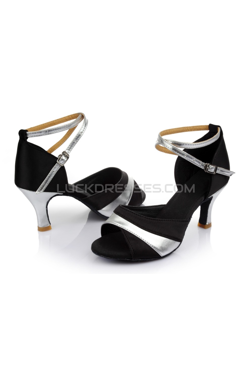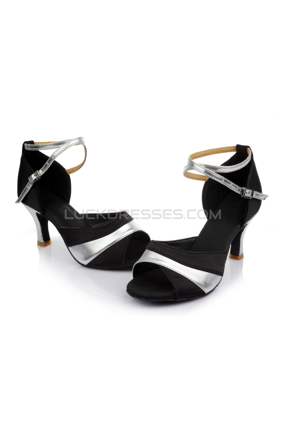 Women's Black Silver Satin Heels Sandals Latin Salsa With Ankle Strap Dance Shoes D602038