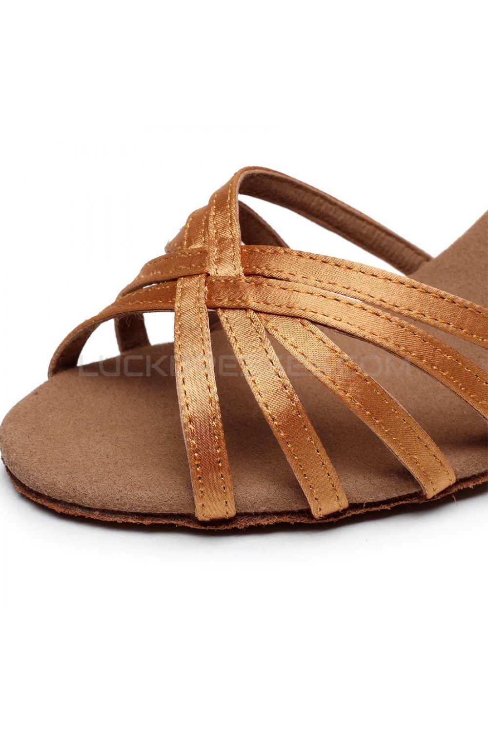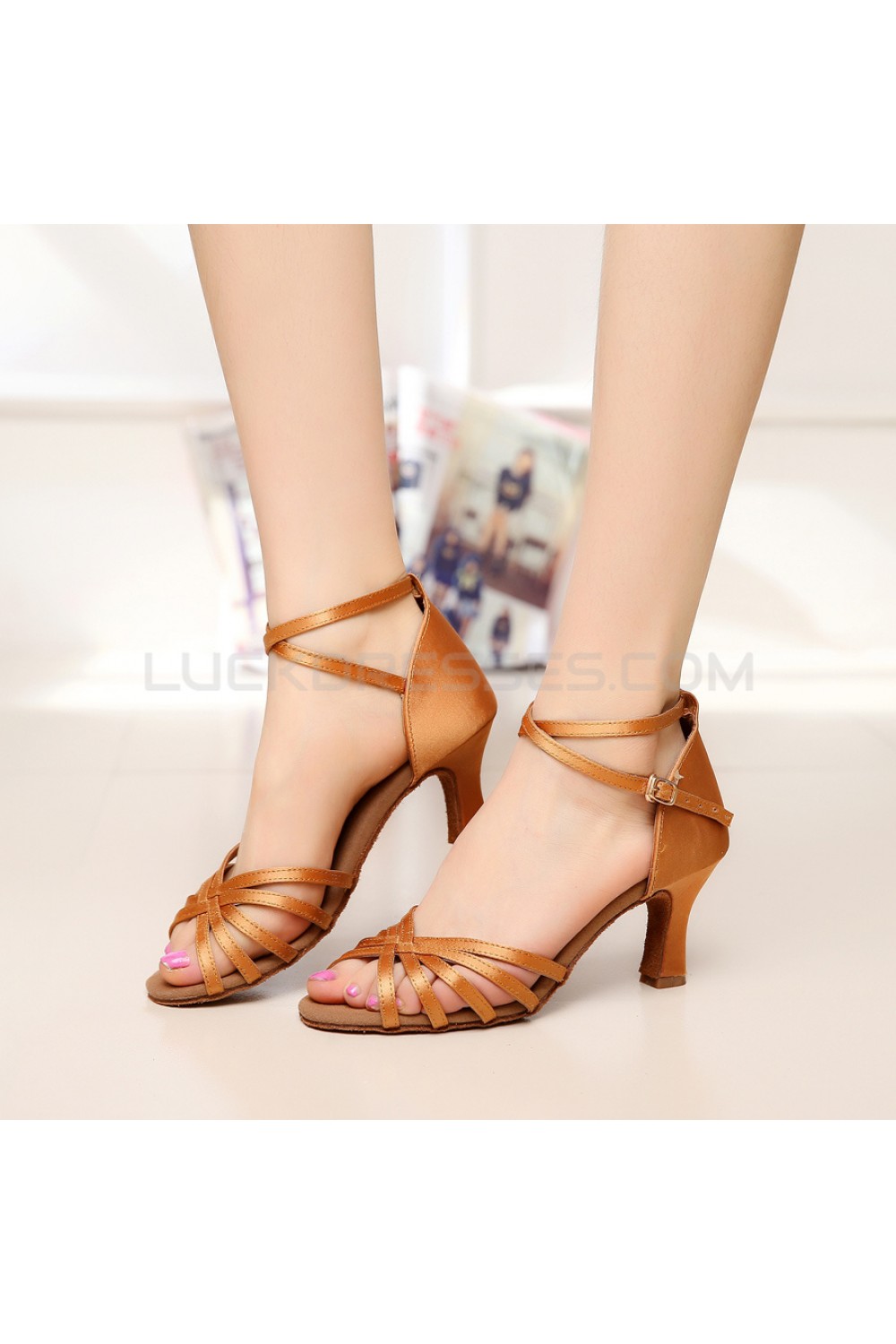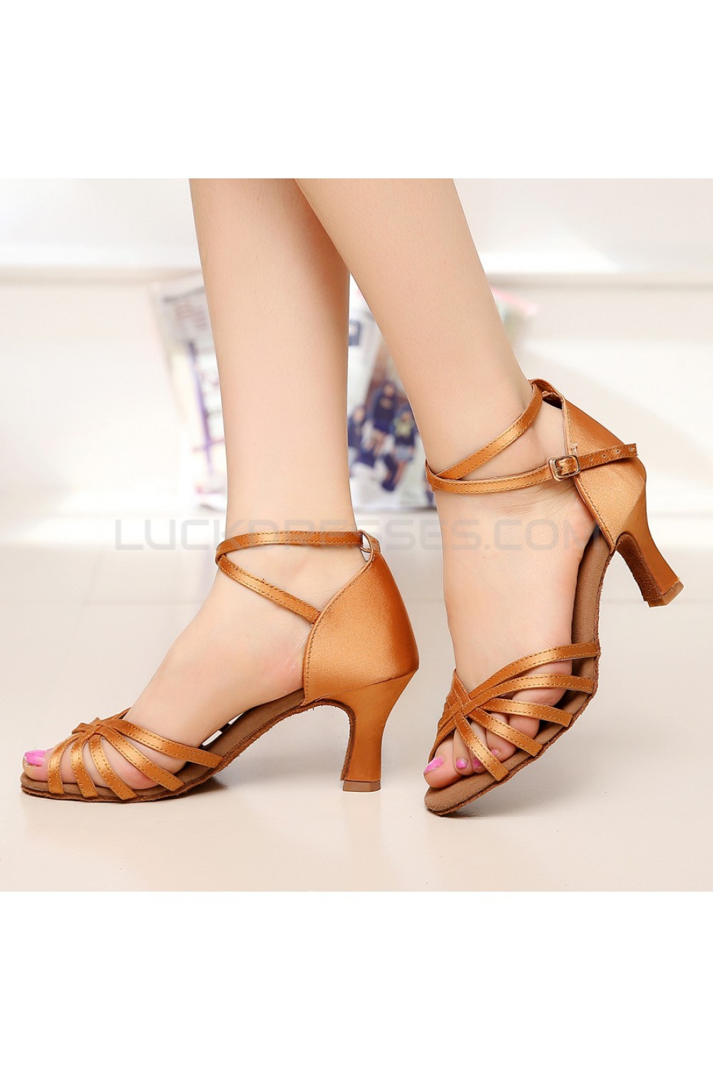 Women's Heels Brown Satin Modern Ballroom Latin Salsa Ankle Strap Dance Shoes D901004