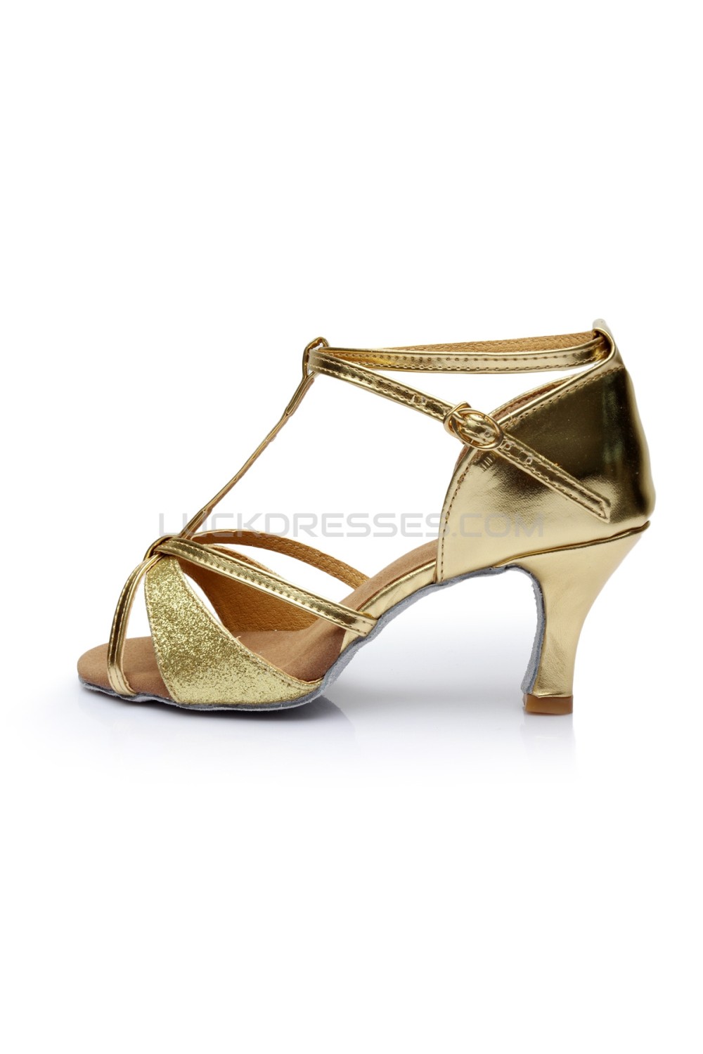 Women's Gold Leatherette Satin Heels Sandals Latin Salsa With T-Strap Buckle Dance Shoes D602006