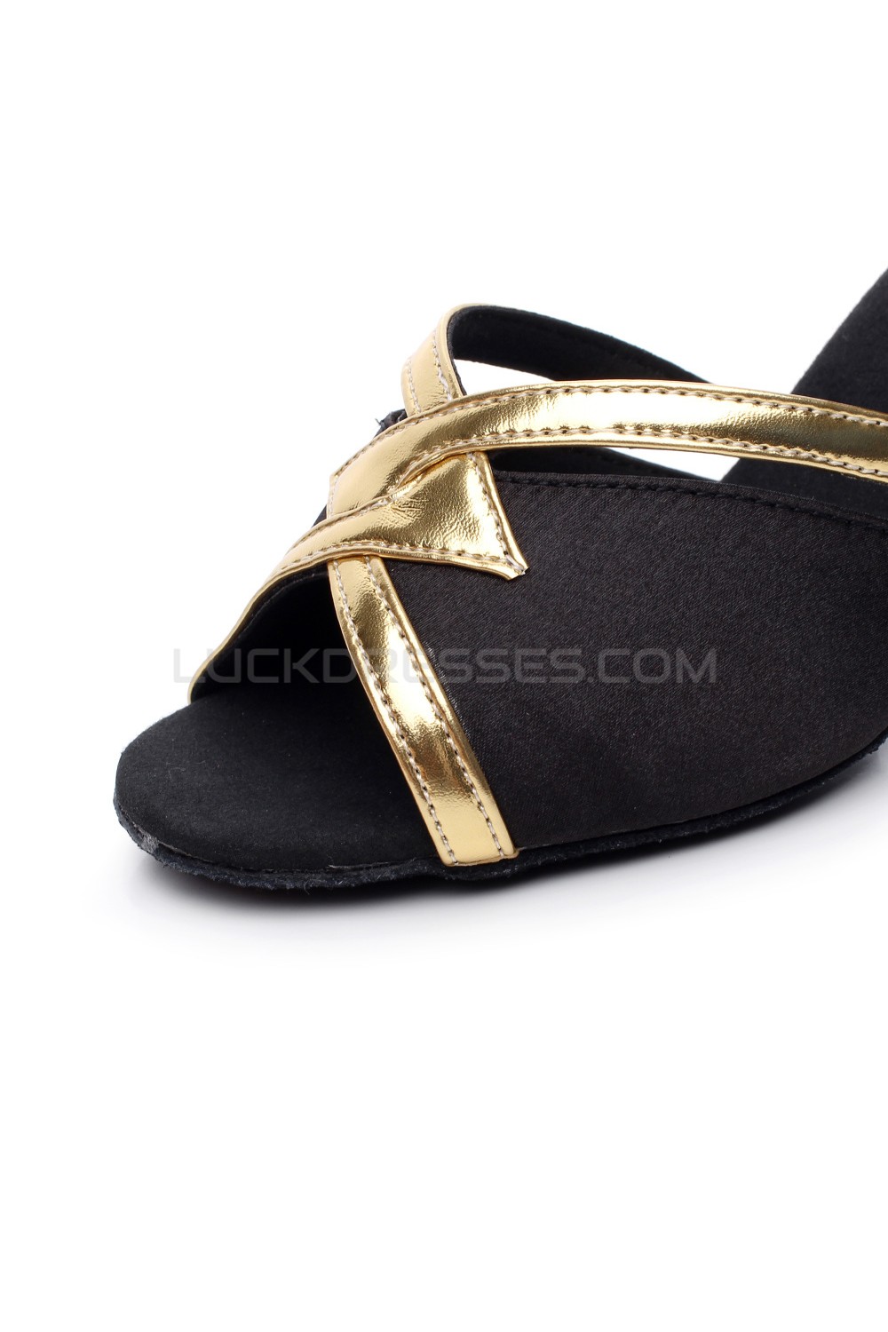 Women's Heels Black Gold Satin Leatherette Modern Ballroom Latin Salsa Ankle Strap Dance Shoes D901014