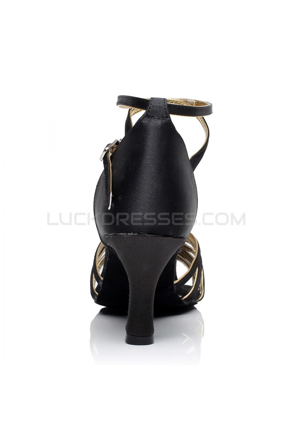 Women's Heels Black Gold Satin Modern Ballroom Latin Salsa Ankle Strap Dance Shoes D901005