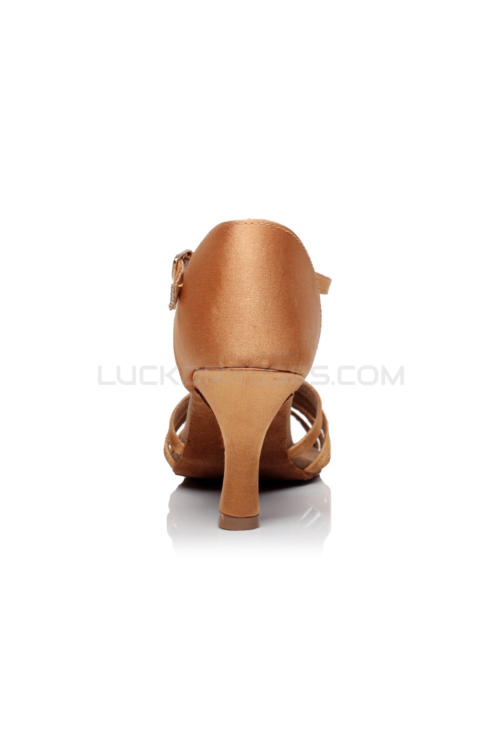 Women's Heels Brown Satin Modern Ballroom Latin Salsa T-Strap Dance Shoes D901019