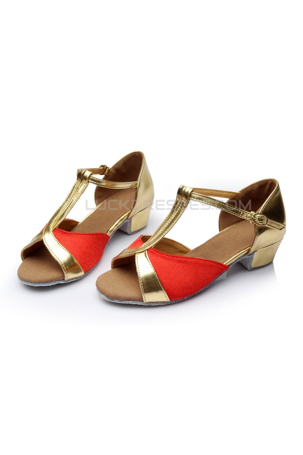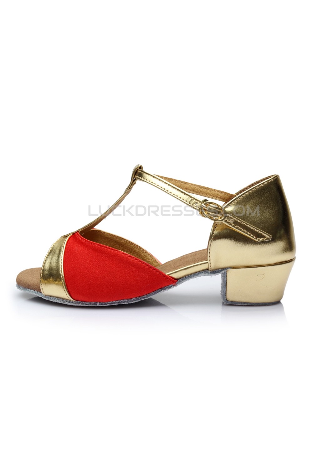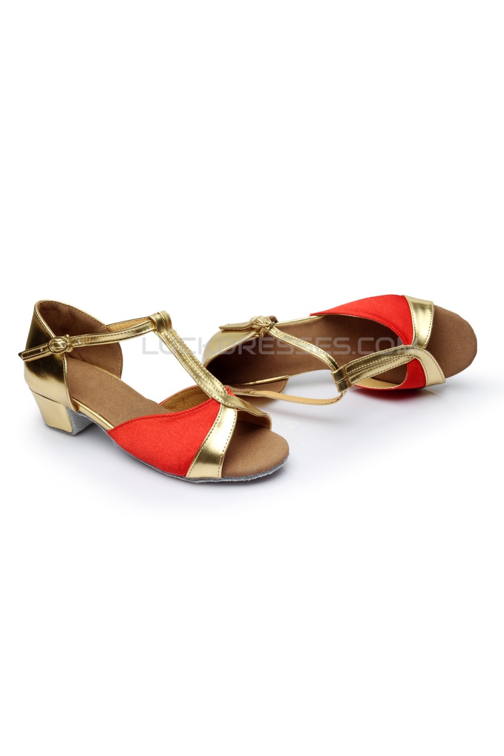 Women's Kids' Red Satin Flats Latin Salsa T-Strap Dance Shoes Chunky Heels Dance Shoes D601034