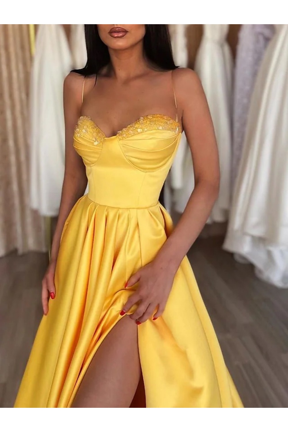 A-Line Long Yellow High Split Spaghetti Strap Sleeveless Satin Prom Dresses Formal Evening Gowns 901820
