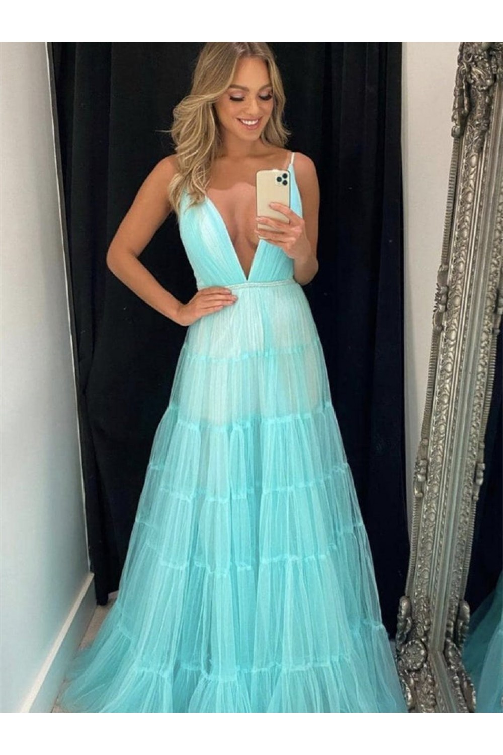 A Line V Neck Spaghetti Straps Long Blue Tulle Prom Dresses 801399