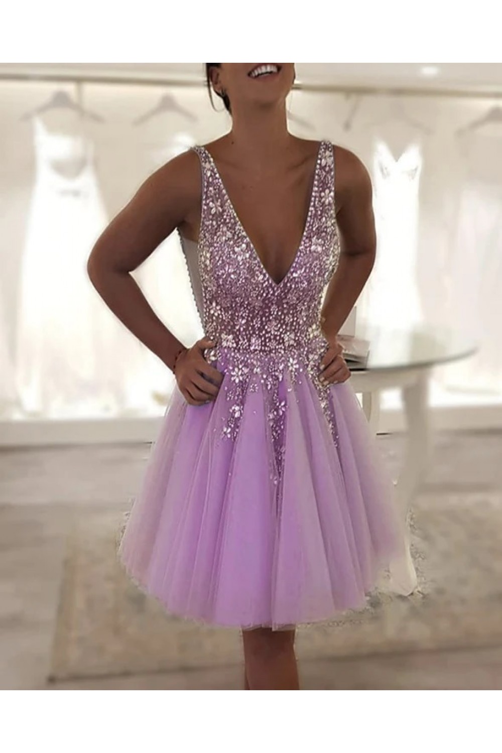 Short/Mini Beaded V Neck Tulle Prom Dresses Homecoming Dresses 904060